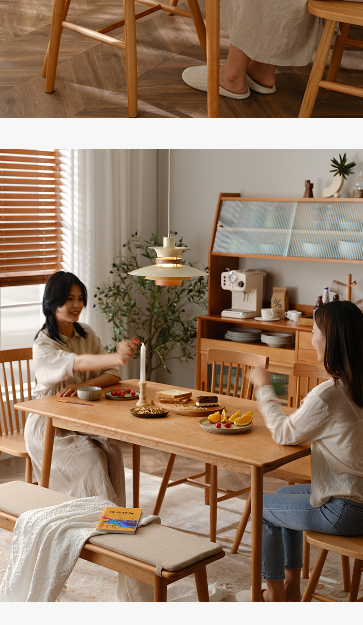 | 商品名称 | 午闲北欧实木食卓现代シンプルチェリー木製食卓家庭用小戸型原木軽奢食卓椅子長方形1.4 m食卓+2把温莎椅子+1.2 mベンチ |